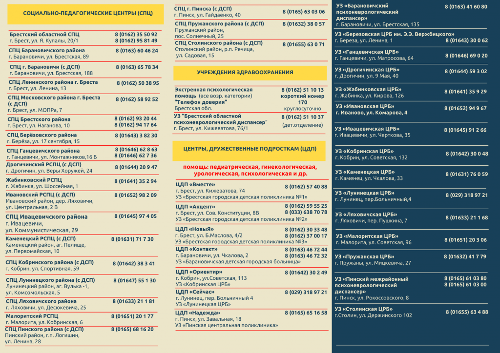 | ГУО «Социально-педагогический центр Березовского района» | Жук Светлана ВладимировнаСырицкая Светлана Тадеушевна | 2-22-70 |
